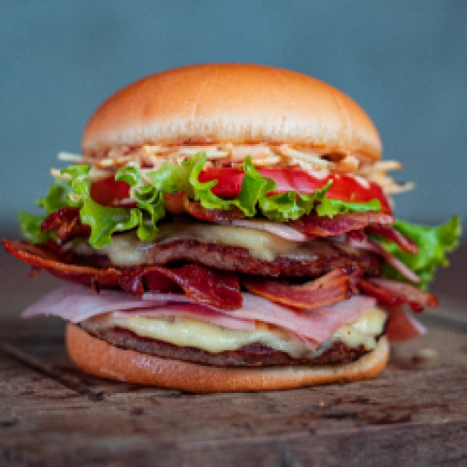 Pão com gergelim, 1 carne sabor picanha 120g, bacon, queijo, presunto, tomate, alface, milho e batata palha especial.