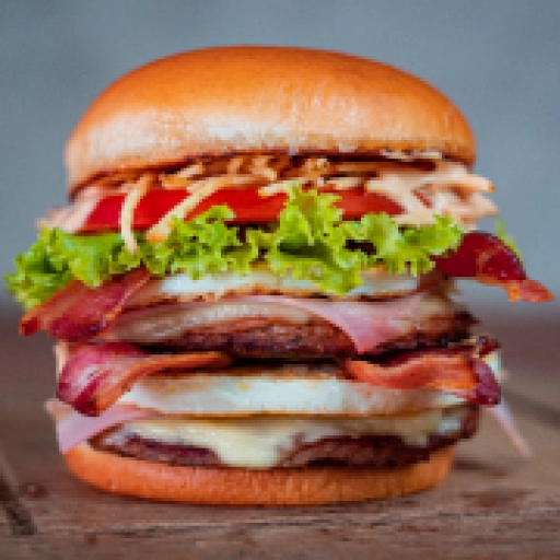 Pão com gergelim, 1 carne sabor picanha 120g, ovo, bacon, frango desfiado, catupiry, 2 onion rings, queijo, presunto, t... Ver completo