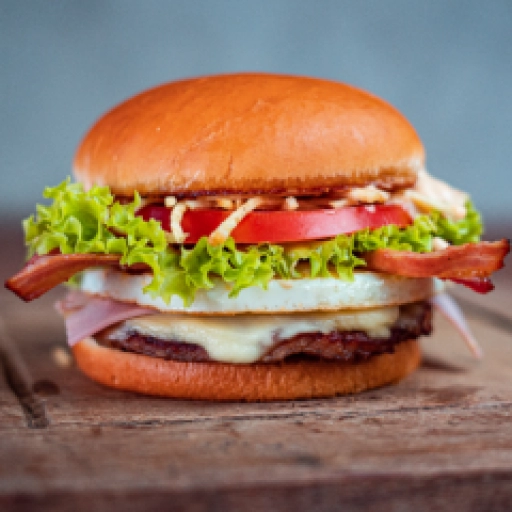 Pão com gergelim, 1 carne sabor picanha 120g, ovo, queijo, presunto, tomate, alface, milho e batata palha especial.